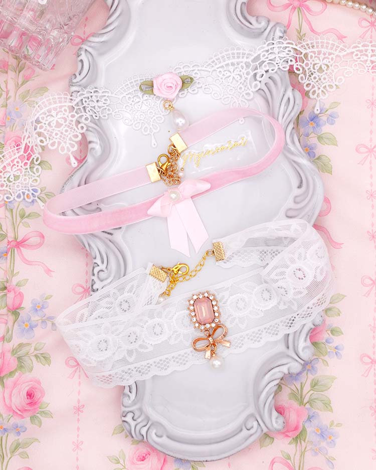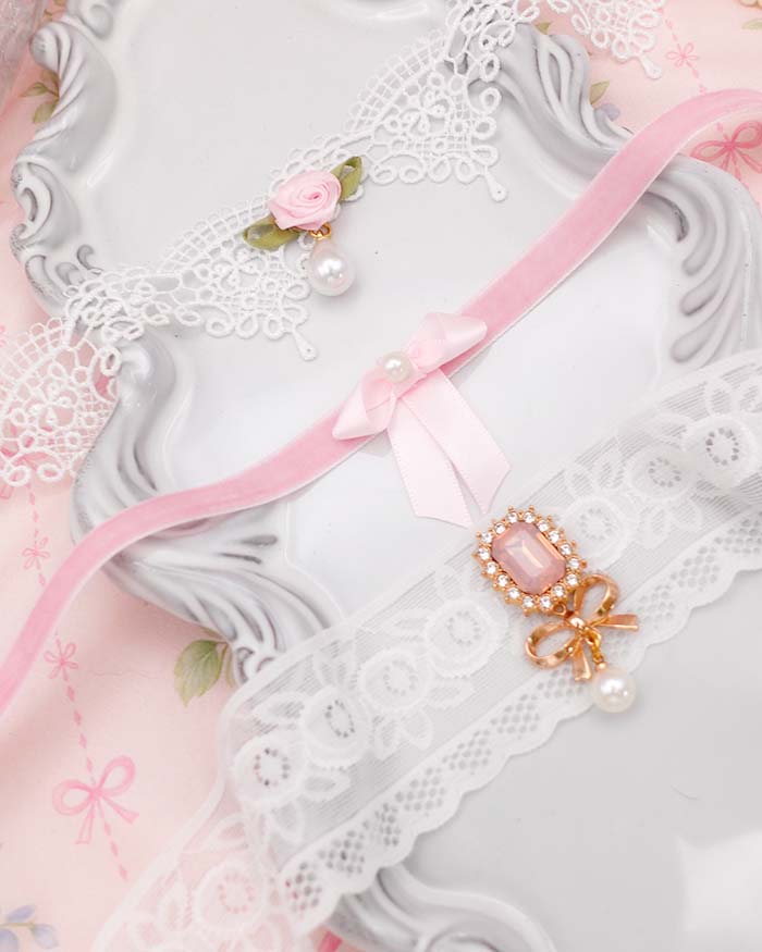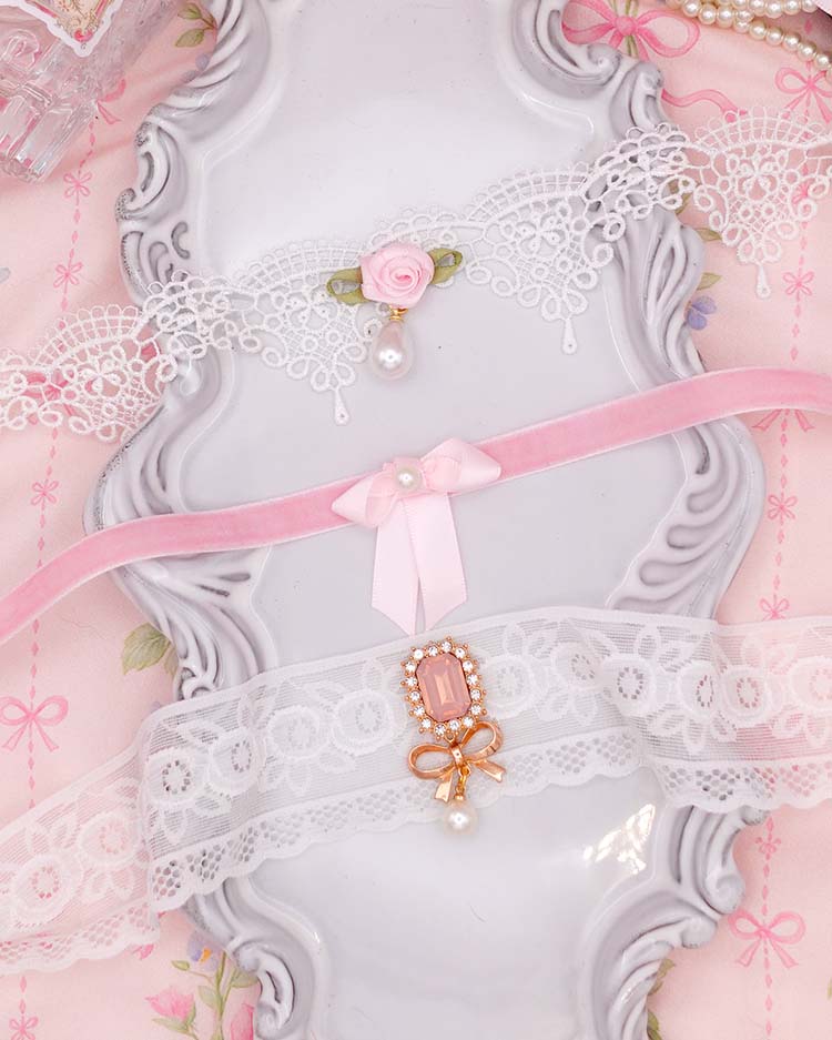 1 pc – Choose your style – Coquette white lace / baby pink velvet choker necklace , bow rhinestone faux pearl , soft princess fairy core