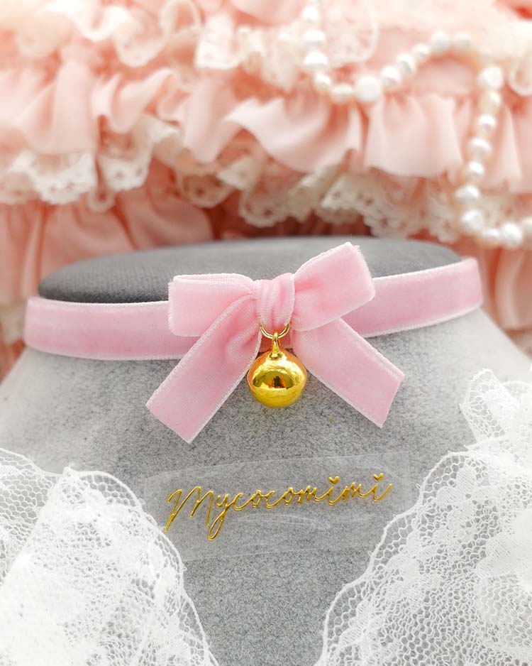 Baby Pink Velvet Choker Necklace with Small Bow and Gold Bell , Tiny cute skinny choker necklace, coquette kitten play day collar