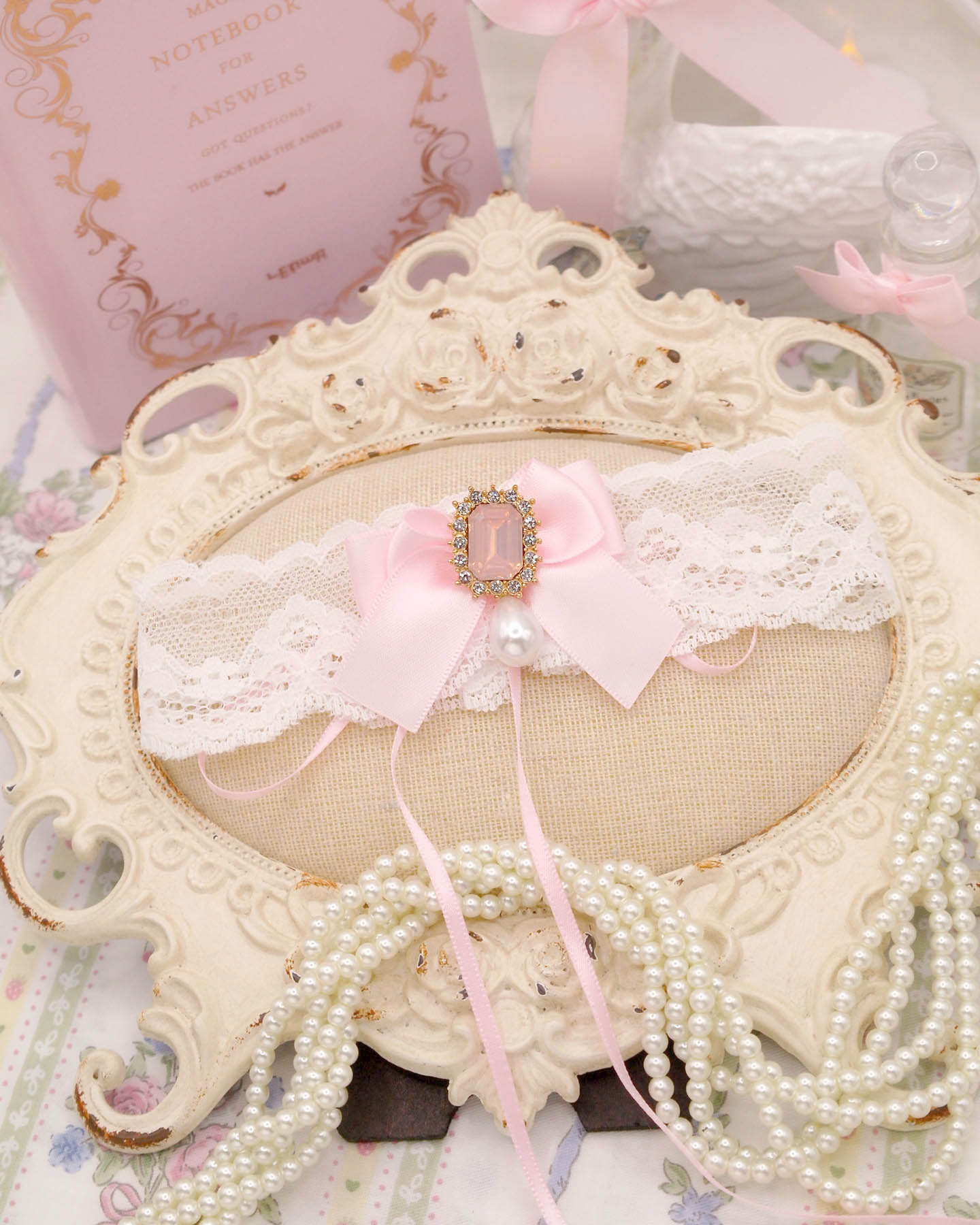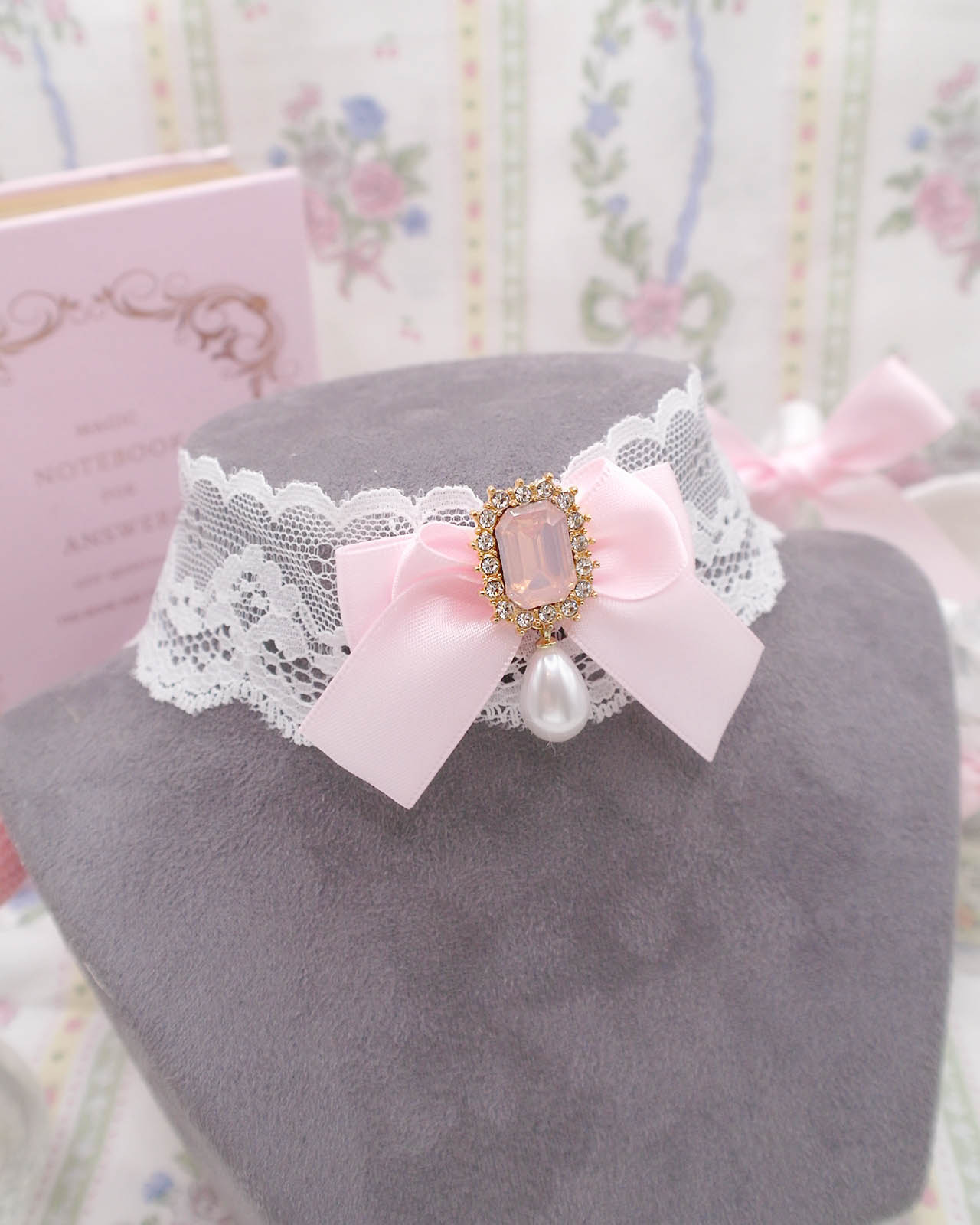 Bling Rhinestone Soft Girl White Lace Baby Pink Bow Ribbon Tie Closure choker necklace , Fairy Core cute day collar jewelry Pretty