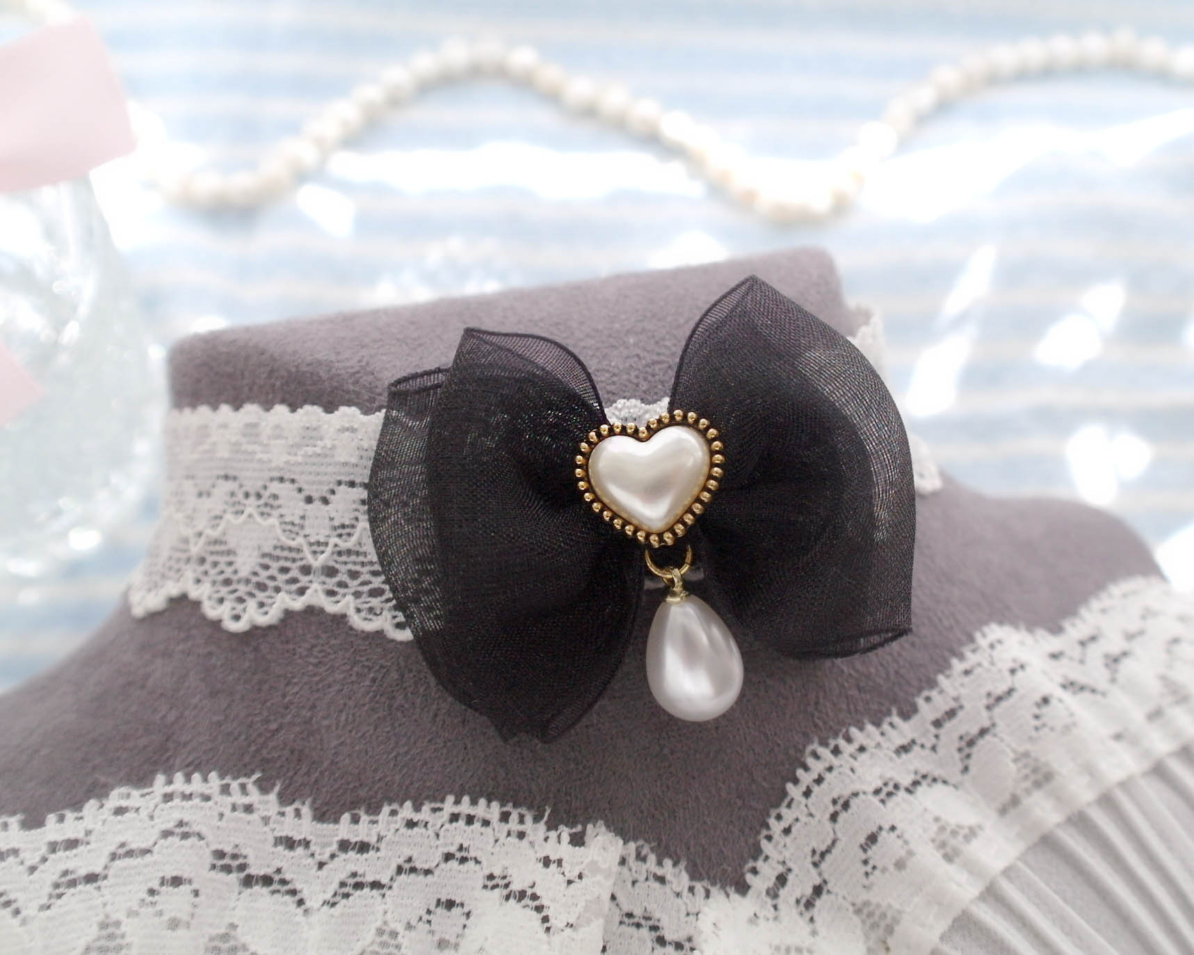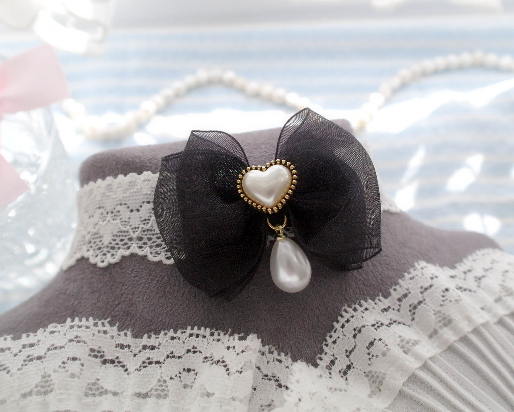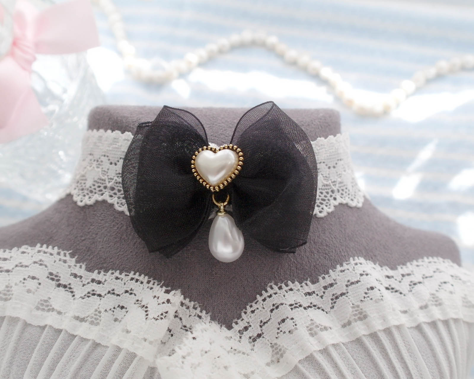 Classic Pearl Heart Black Bow White Lace choker necklace ,with a faux pearl pendant , Timeless Glam Princess Core jewelry ,Handmade