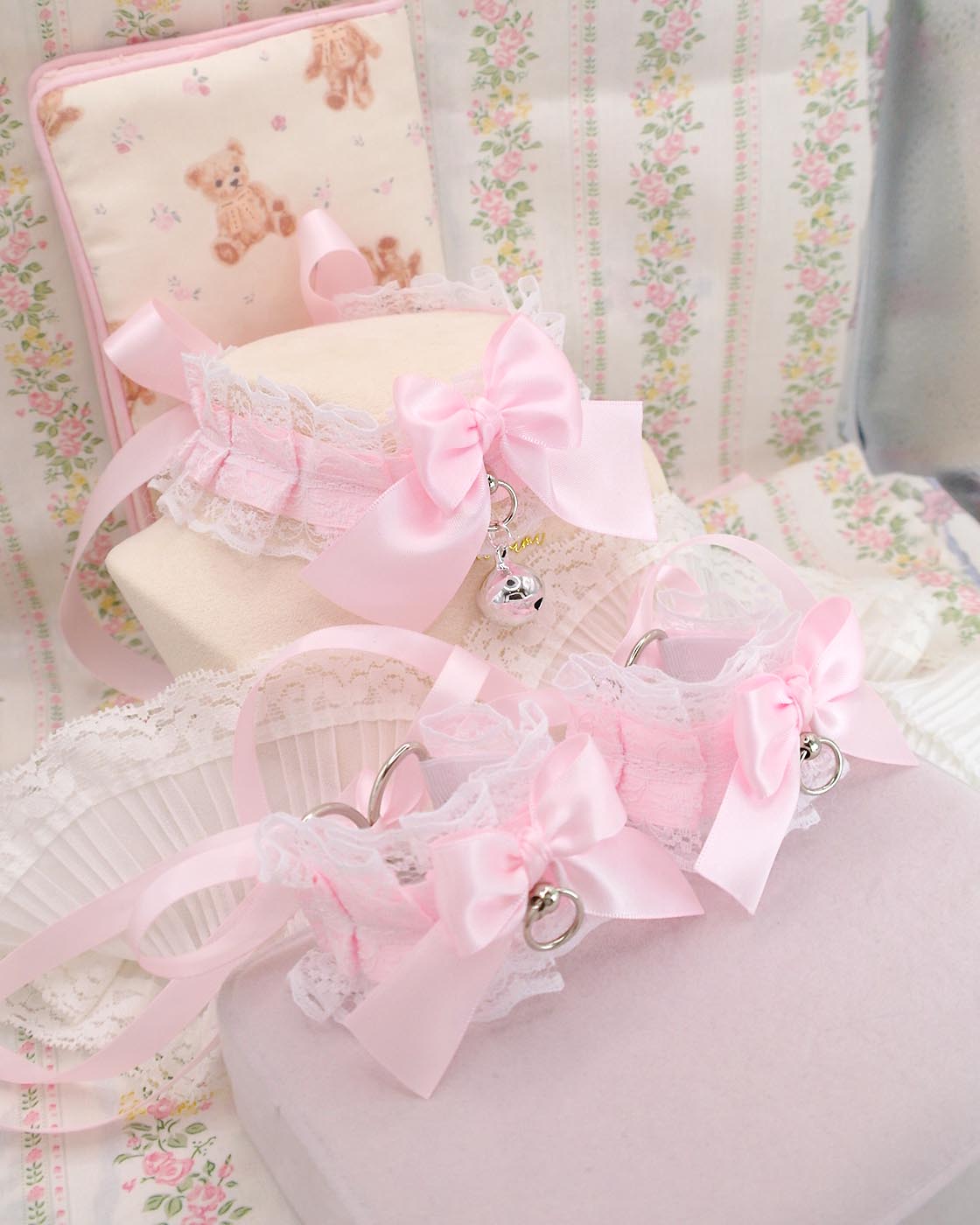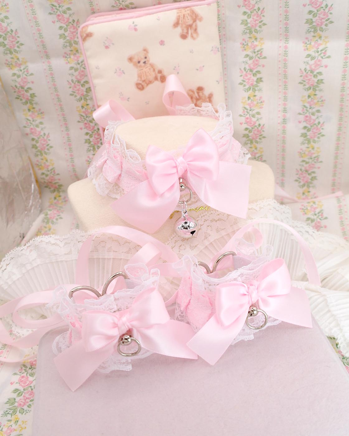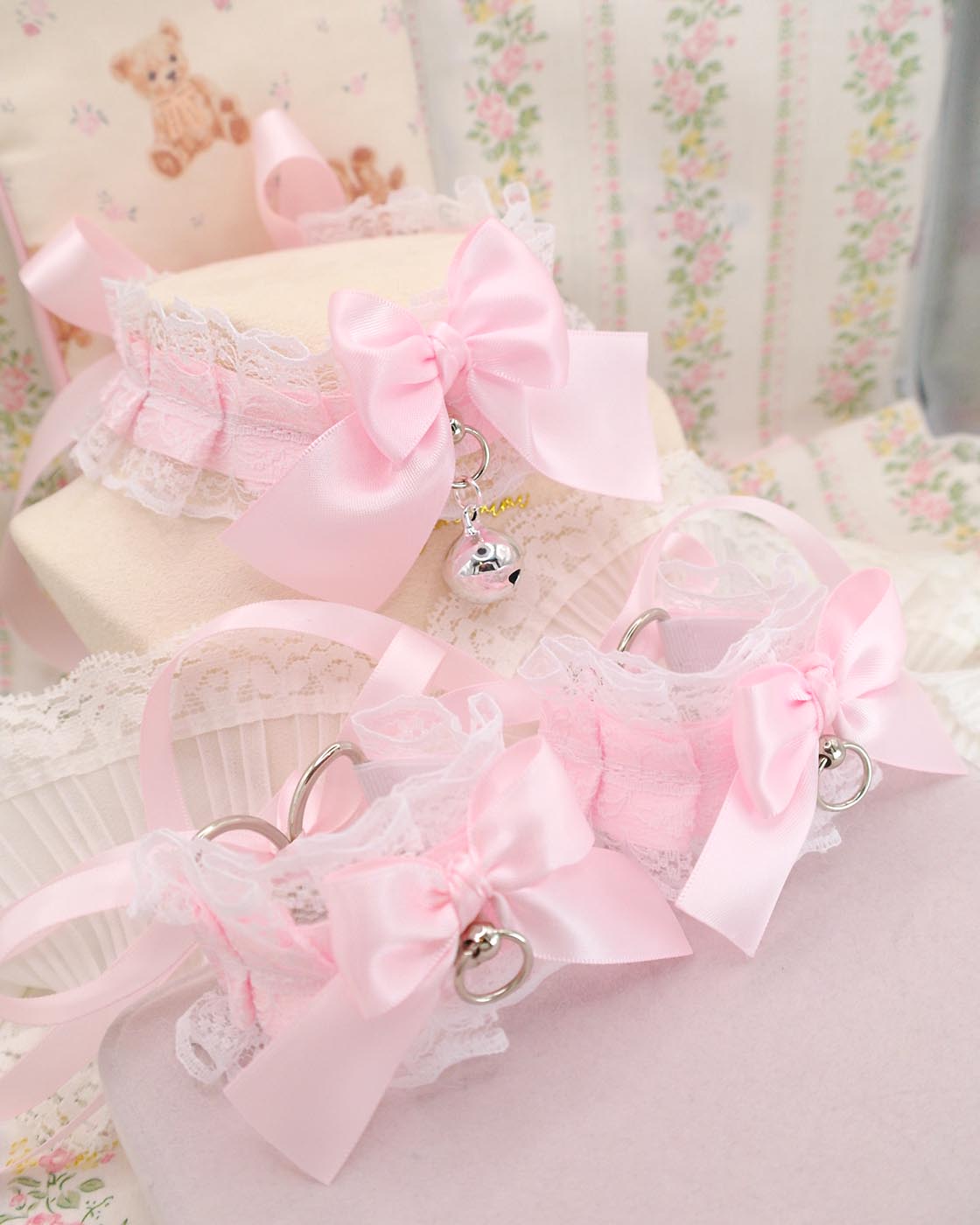 Collar and Cuffs Set , Baby Pink Bow White Lace Kitten Pet Play Gear, Costume Choker Necklace With Bell , pastel DDLG Cute