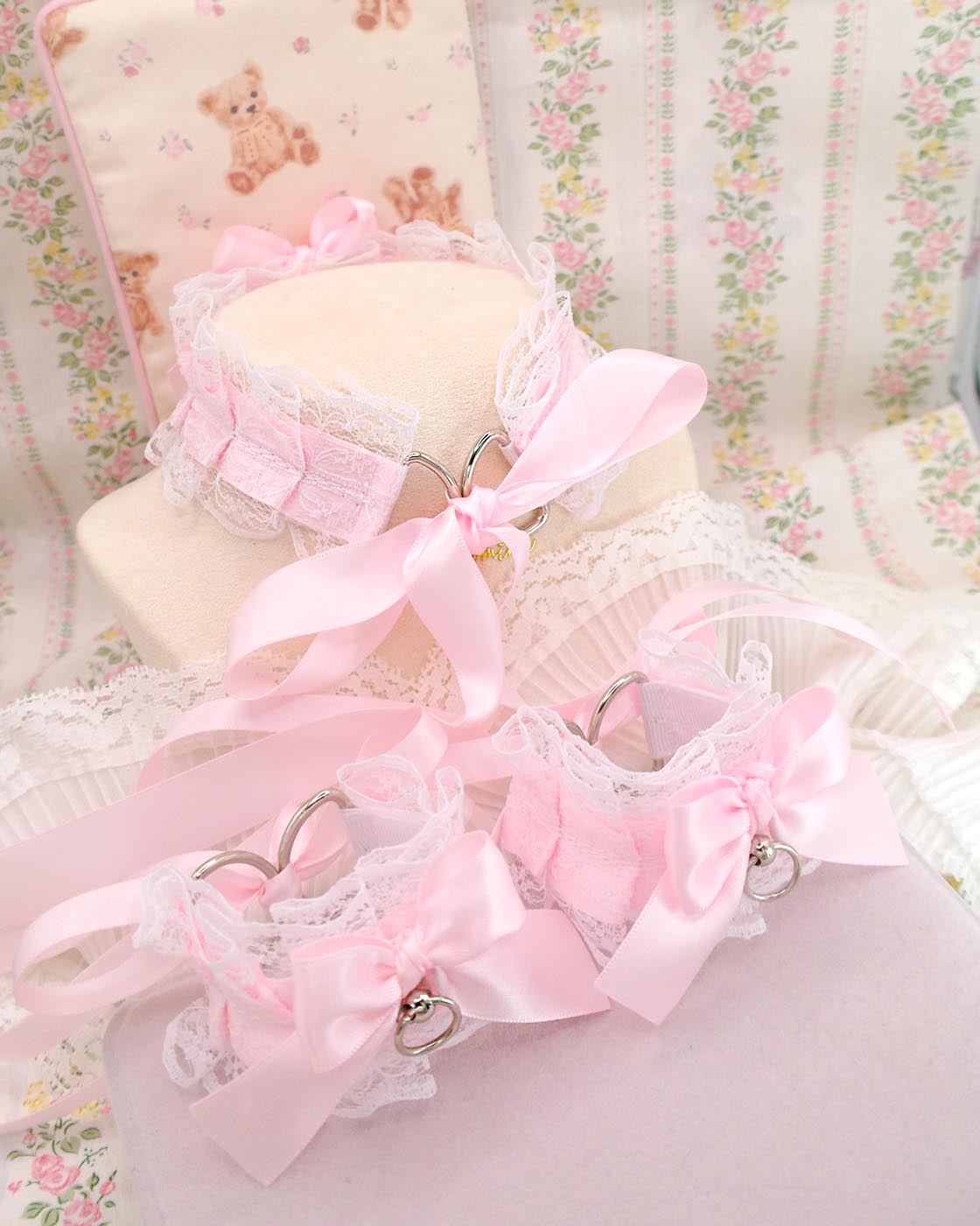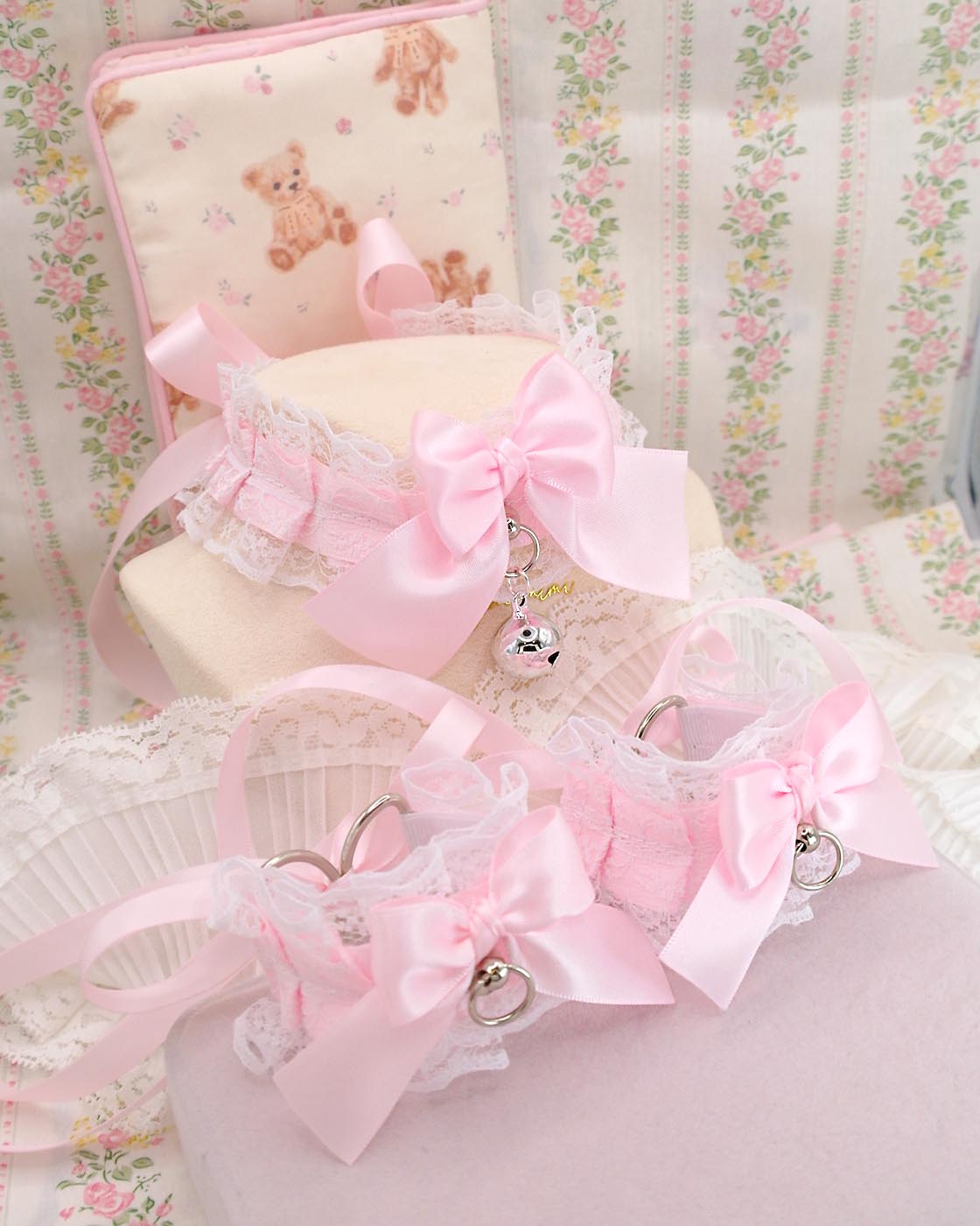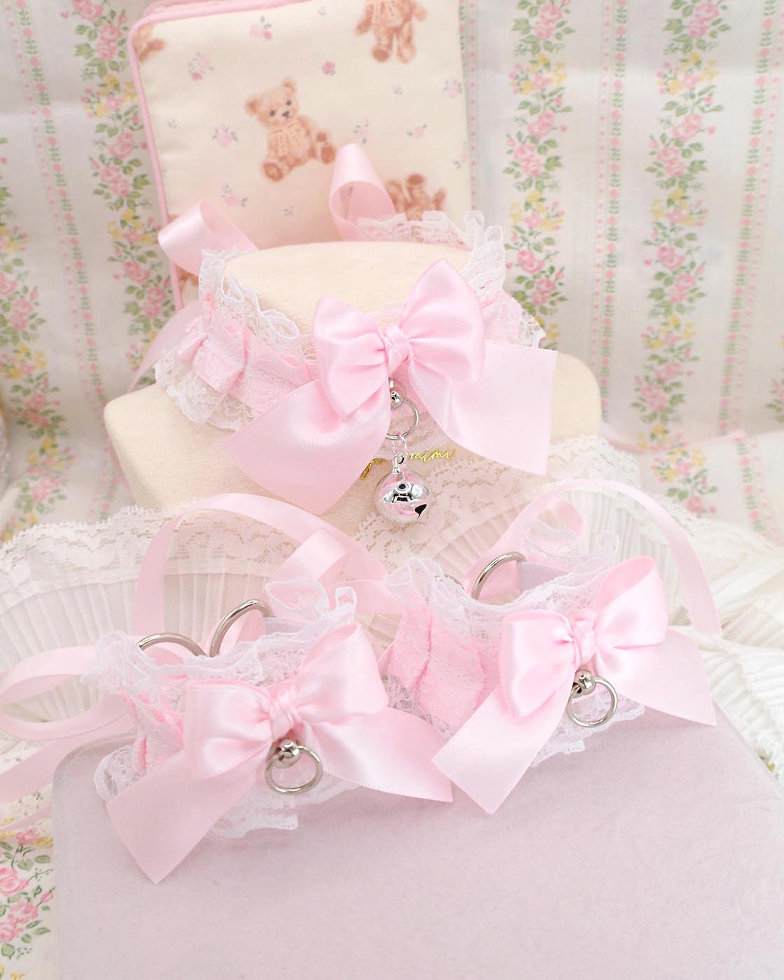 Collar and Cuffs Set , Baby Pink Bow White Lace Kitten Pet Play Gear, Costume Choker Necklace With Bell , pastel DDLG Cute