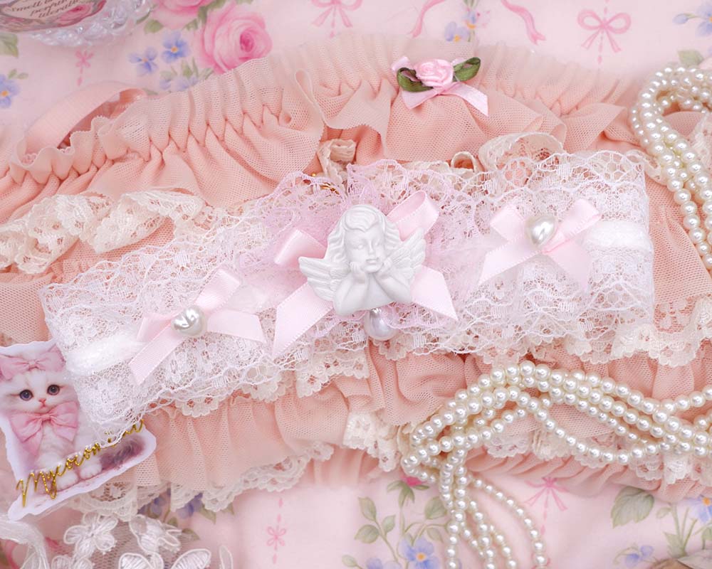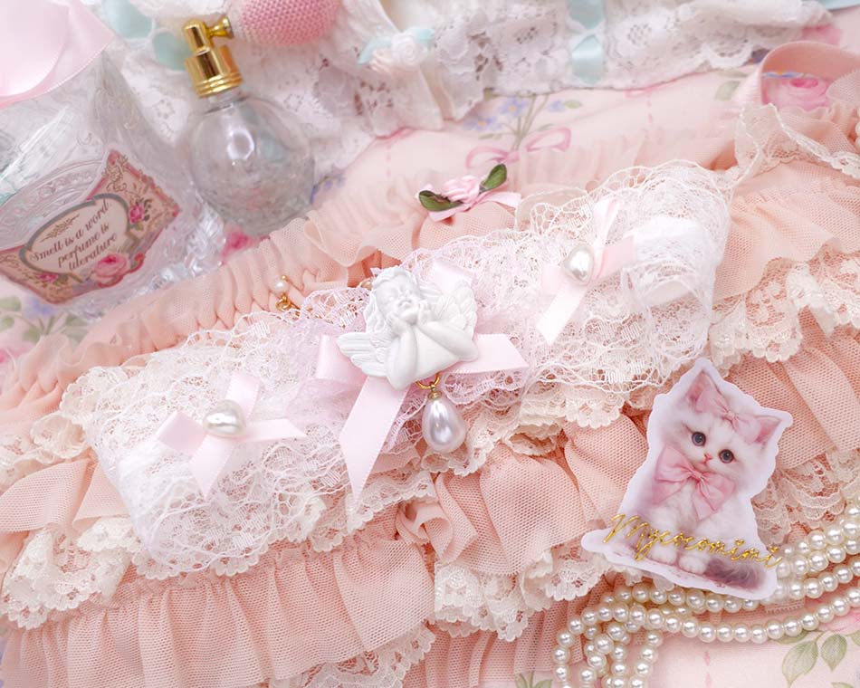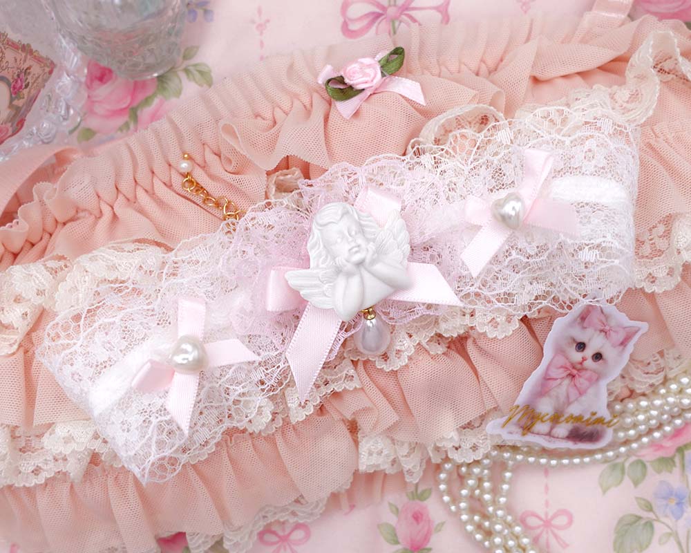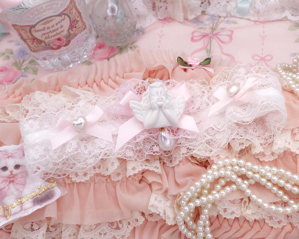 Coquette Angelic Cupid Charm White Lace Ruffles Choker Necklace, Baby Pink Bow Faux Pearl Heart, Fairy Soft Girl Core day collar