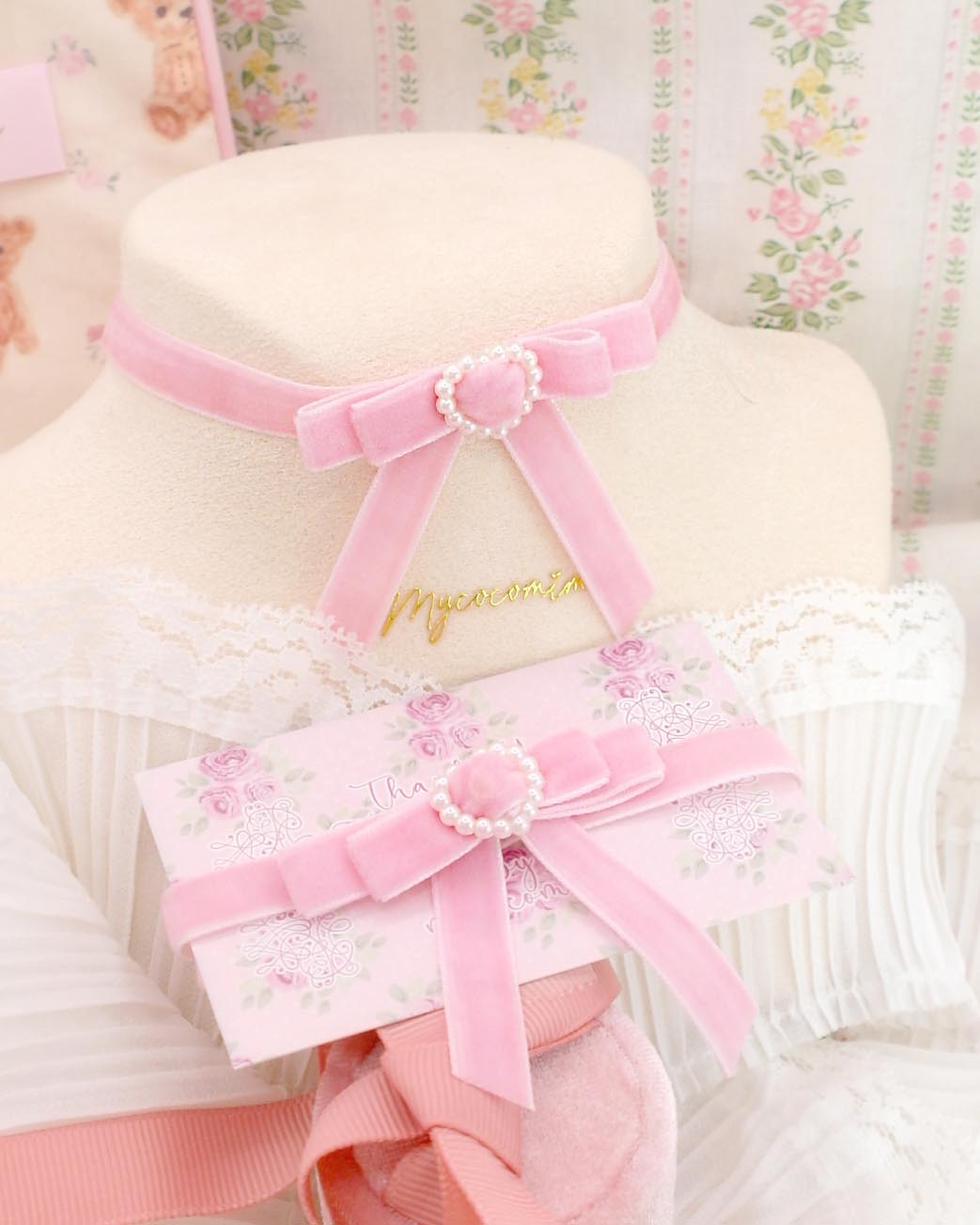 Coquette baby pink velvet little bow choker necklace , faux pearl heart , soft girl core pastel day Skinny collar jewelry