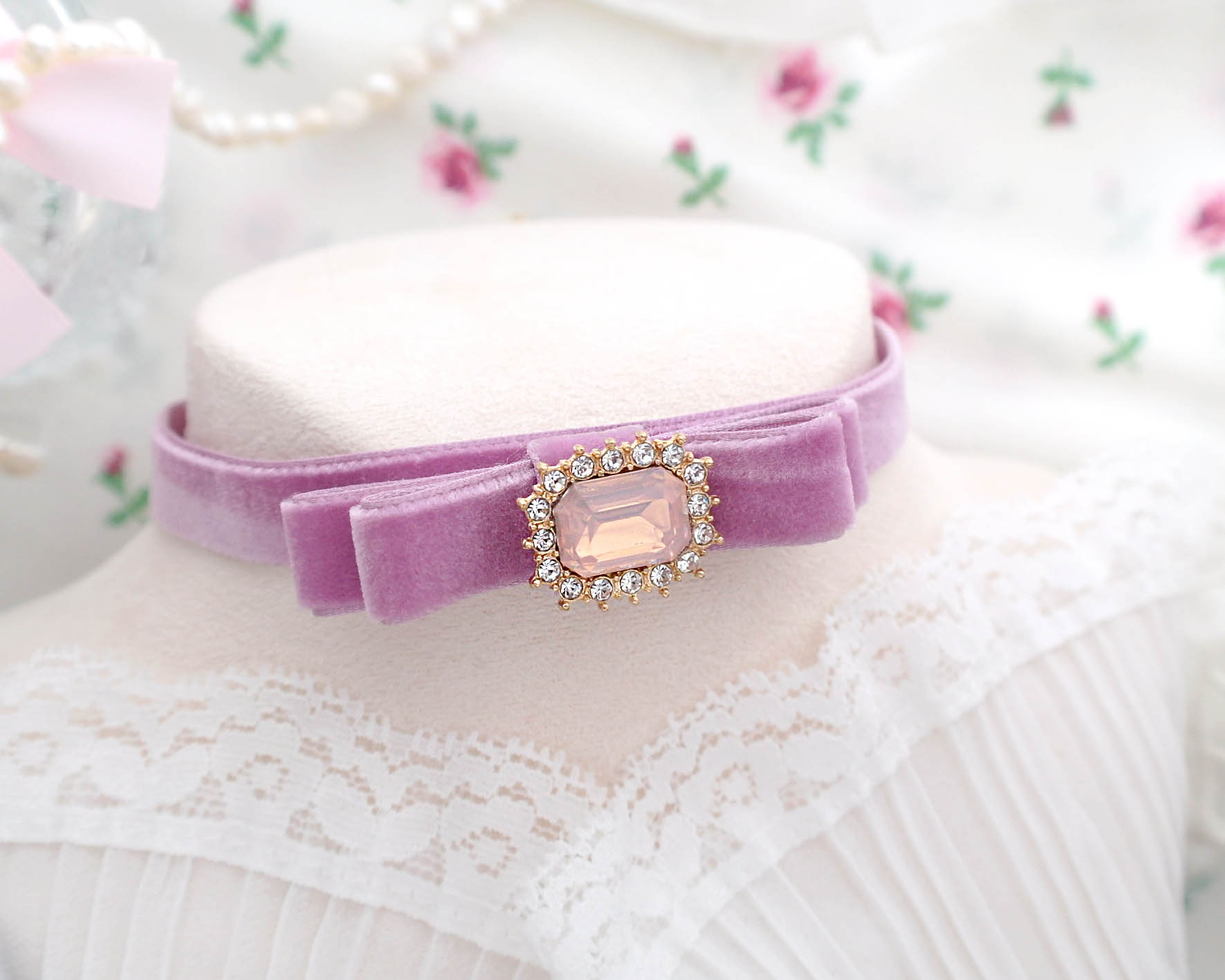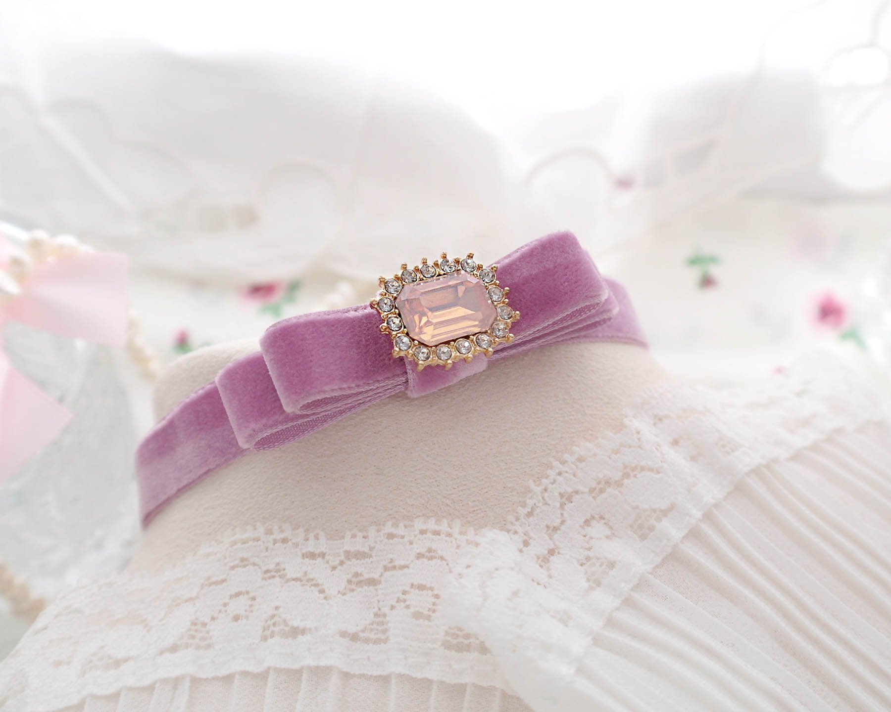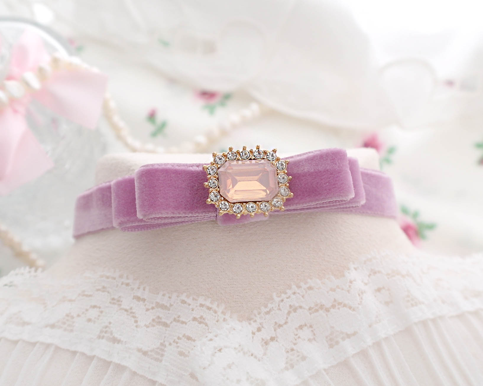 Coquette Lilac Purple Velvet Bow choker necklace, bling rhinestone soft girl day collar Fairy princess core , hanamade Jewelry