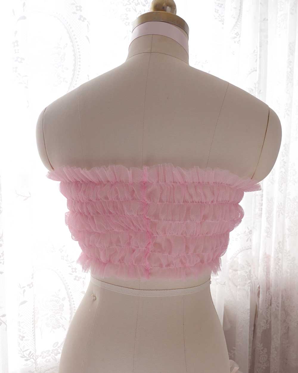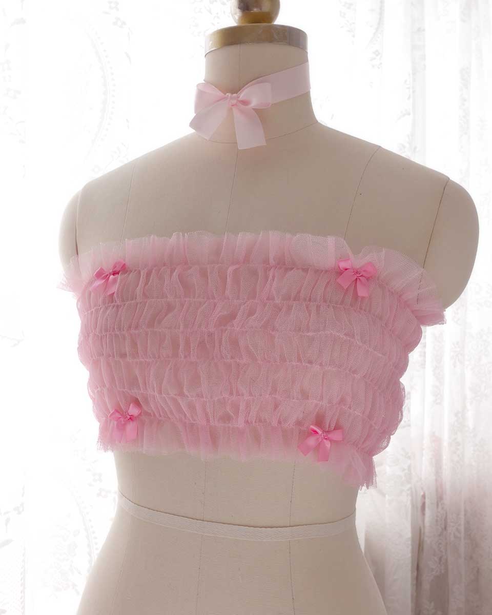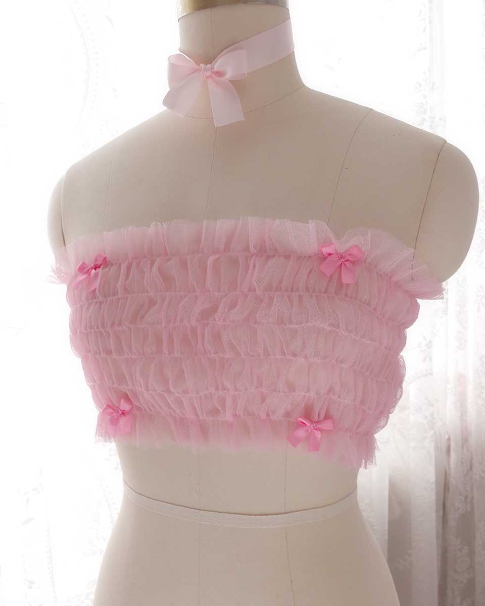Coquette Romantic Baby Pink Bow Tulle Tube Top Crop Top Off shoulder Mesh top Lingerie ,Kawaii Clothes Handmade