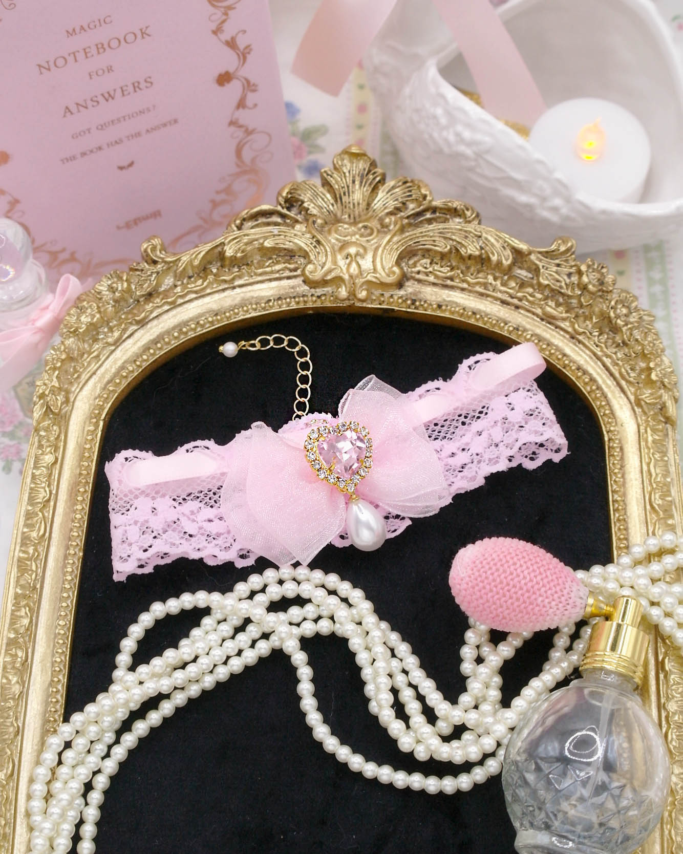 Be the first to review “Coquette Sweet baby pink lace choker necklace , bow heart rhinestone with a faux pearl pendant, princess soft girl core jewelry day collar”