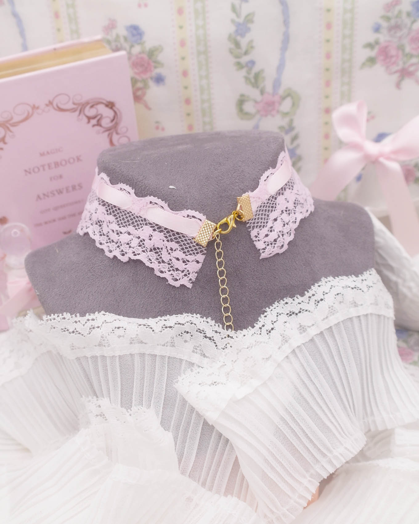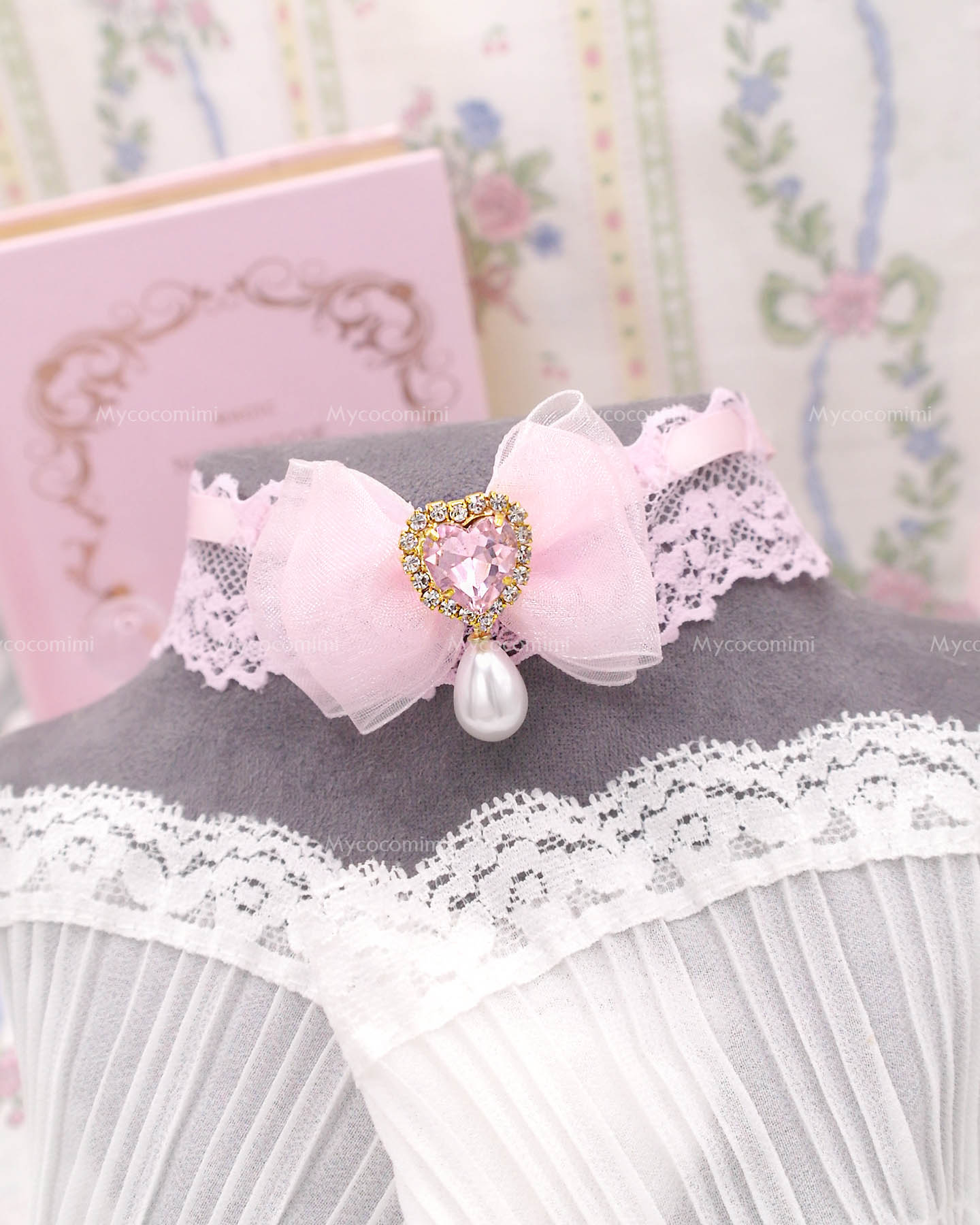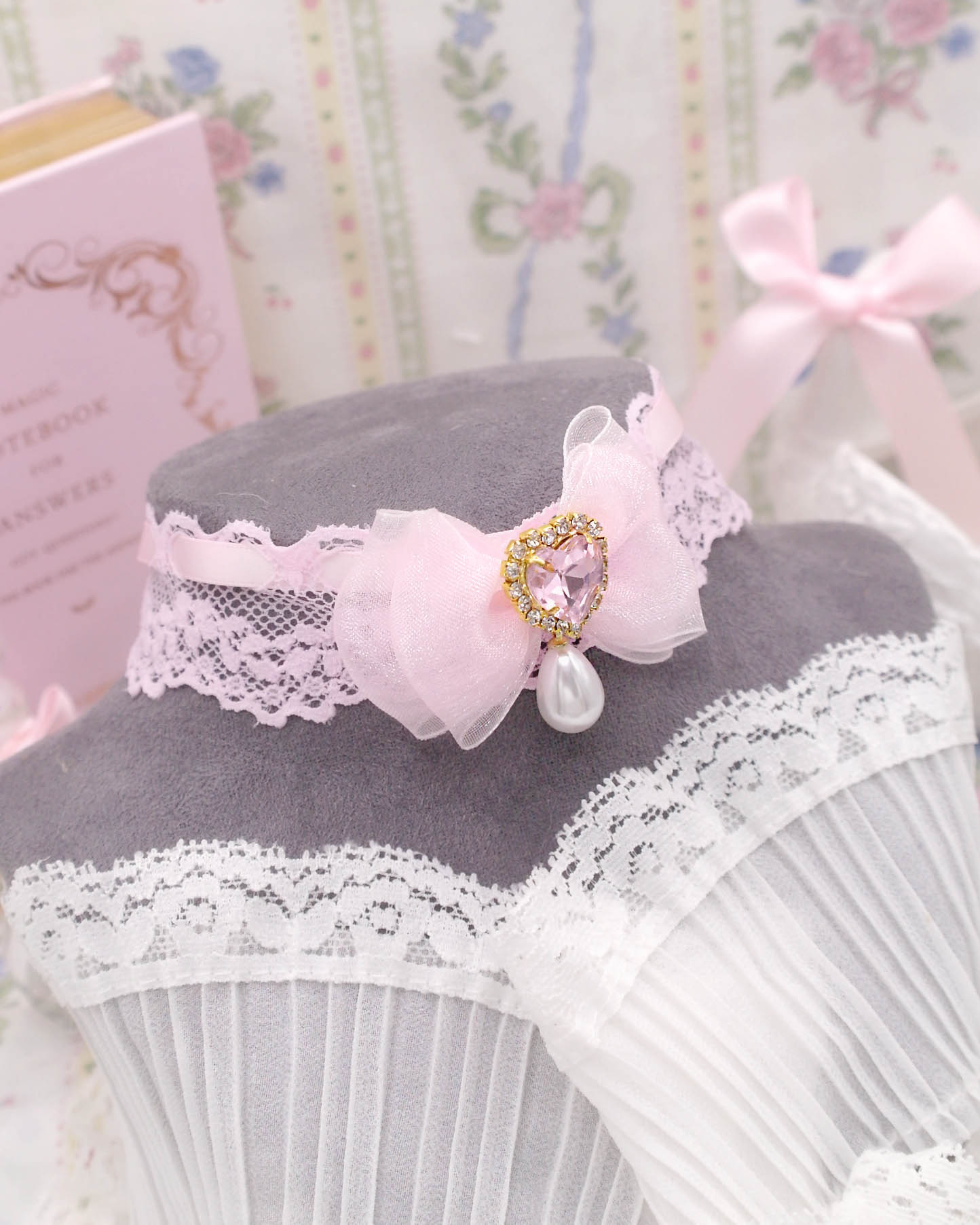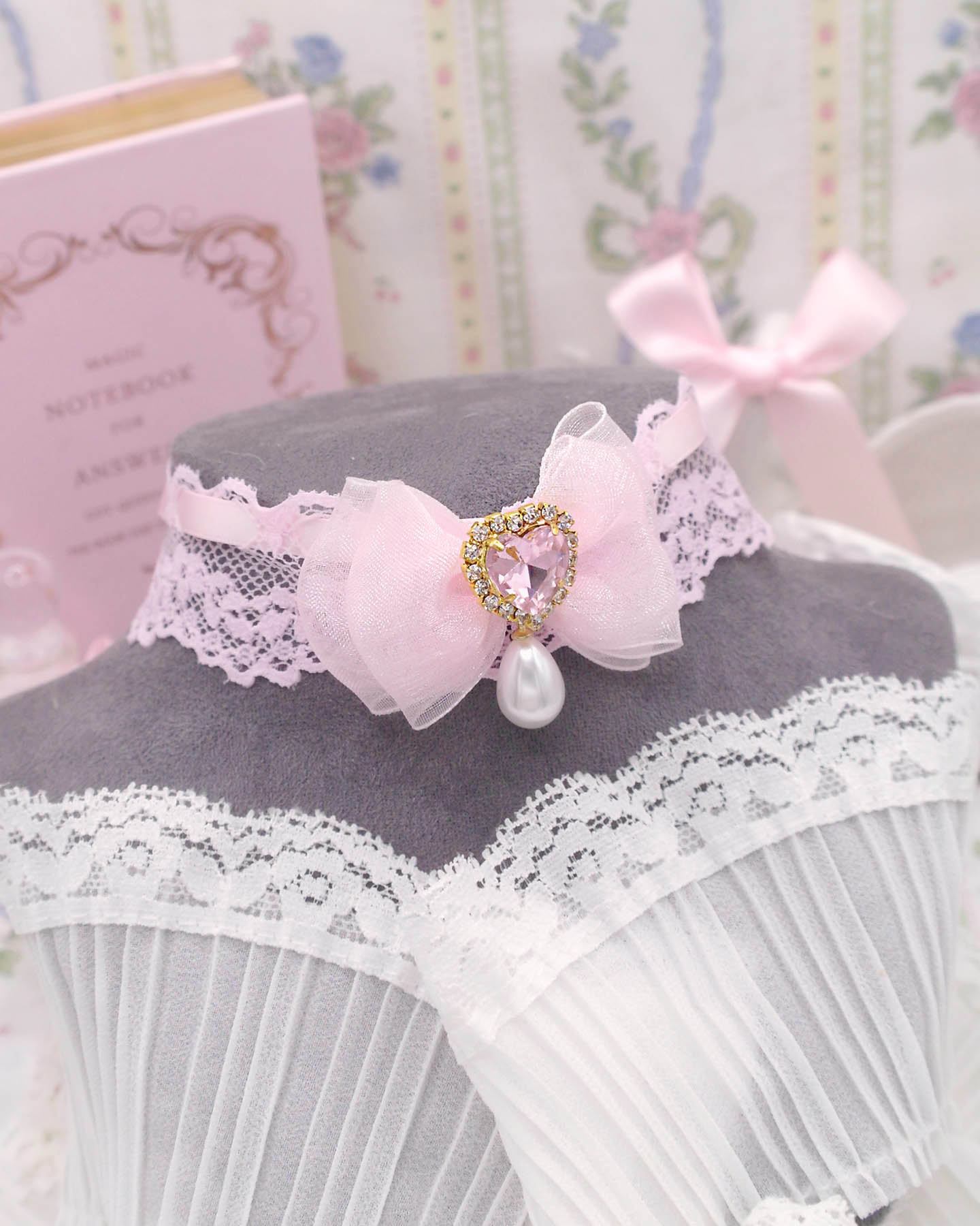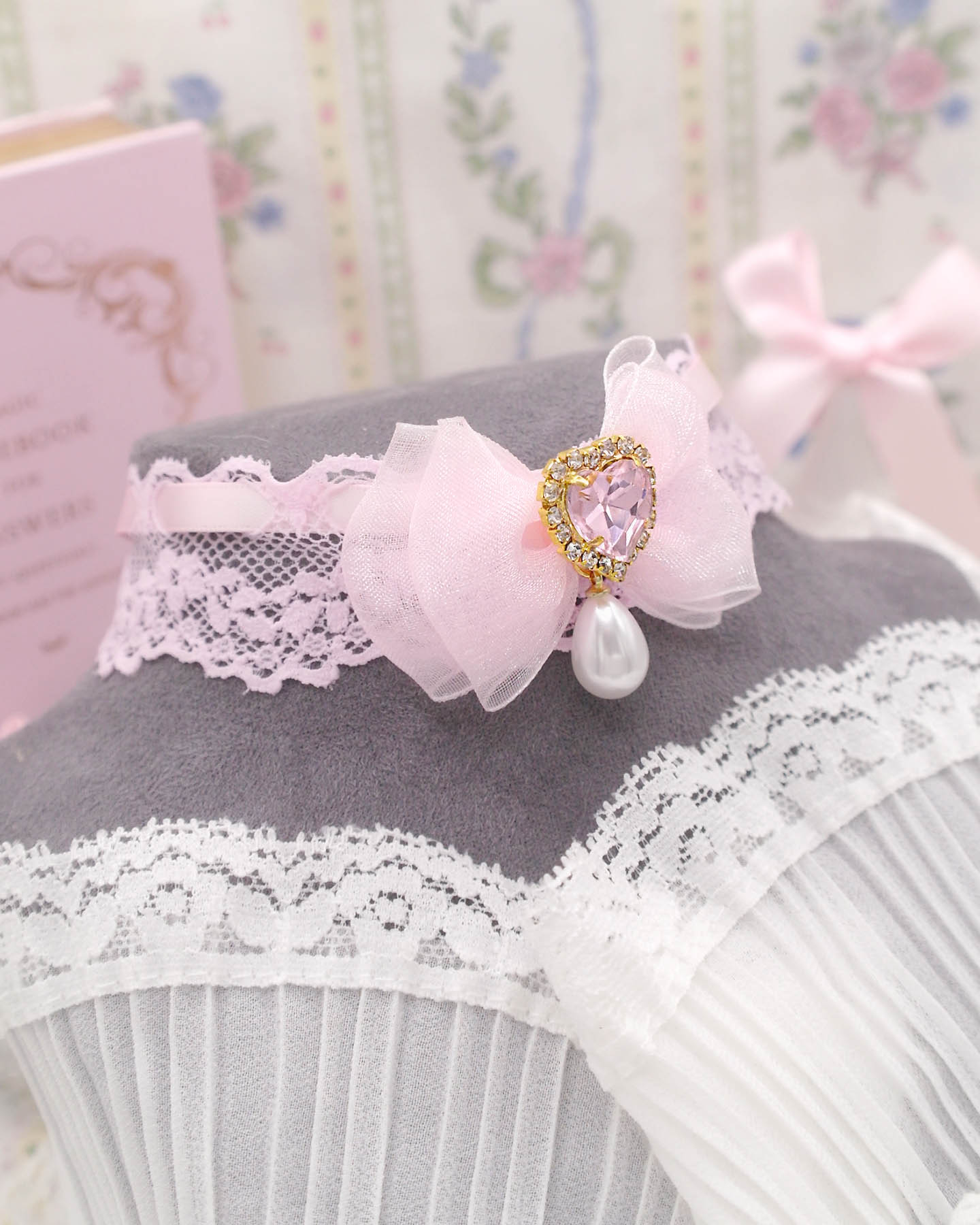 Coquette Sweet baby pink lace choker necklace , bow heart rhinestone with a faux pearl pendant, princess soft girl core jewelry day collar