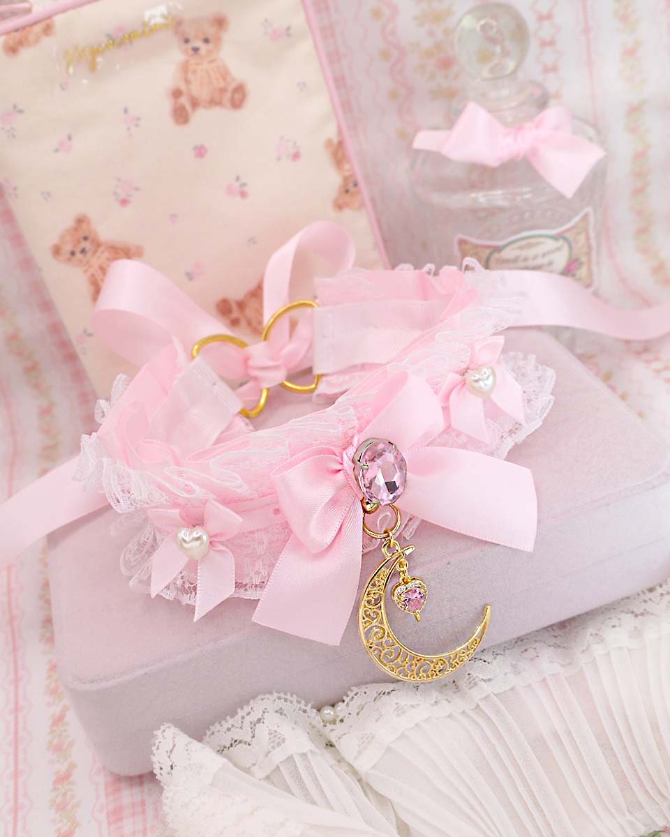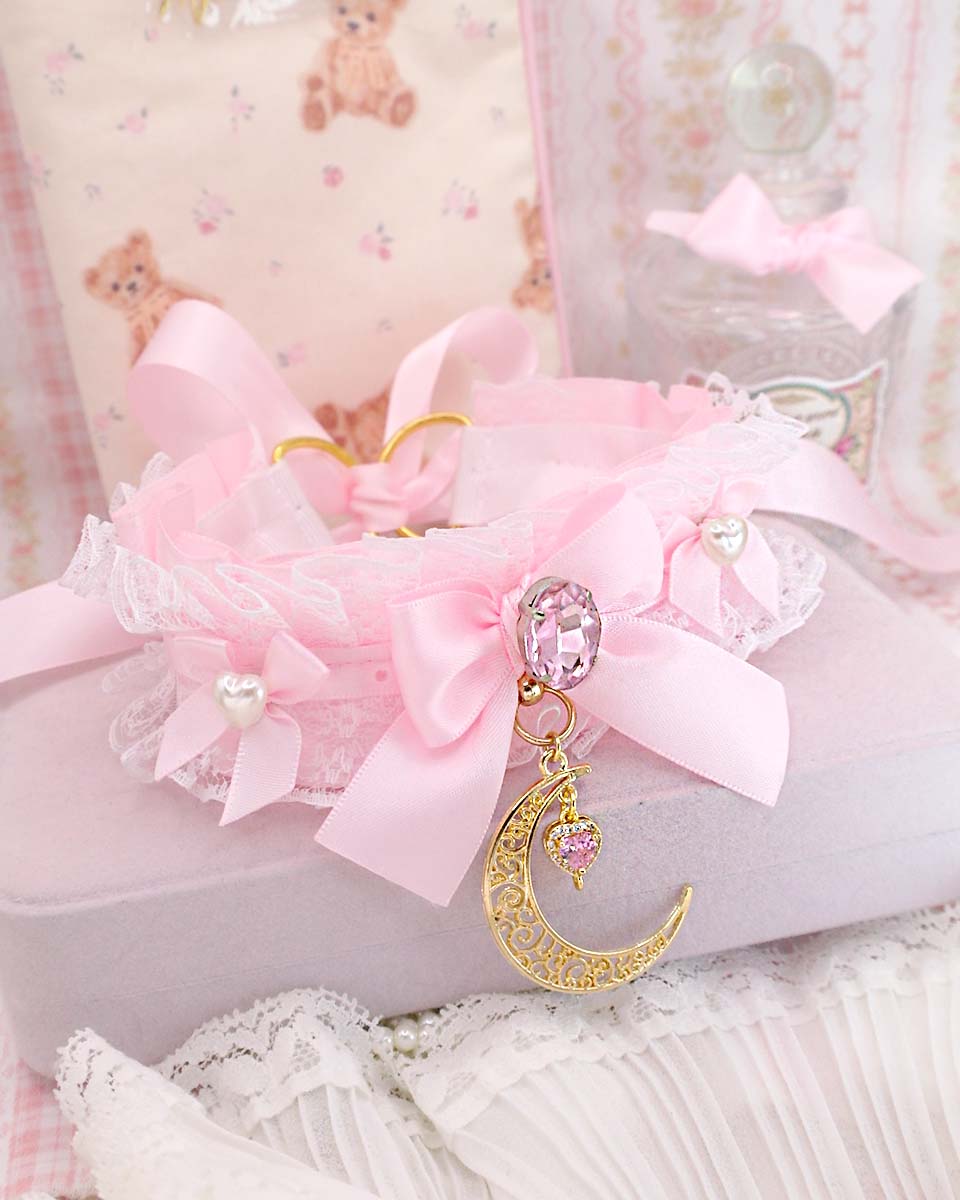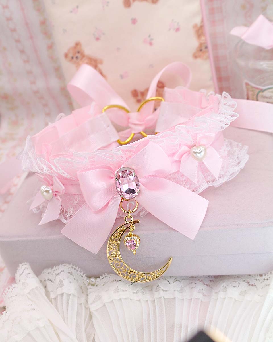 Dreamy gold crescent moon baby pink choker necklace , kitten pet play collar , white lace ruffles rhinestone bling pearl bow, Fairy Core