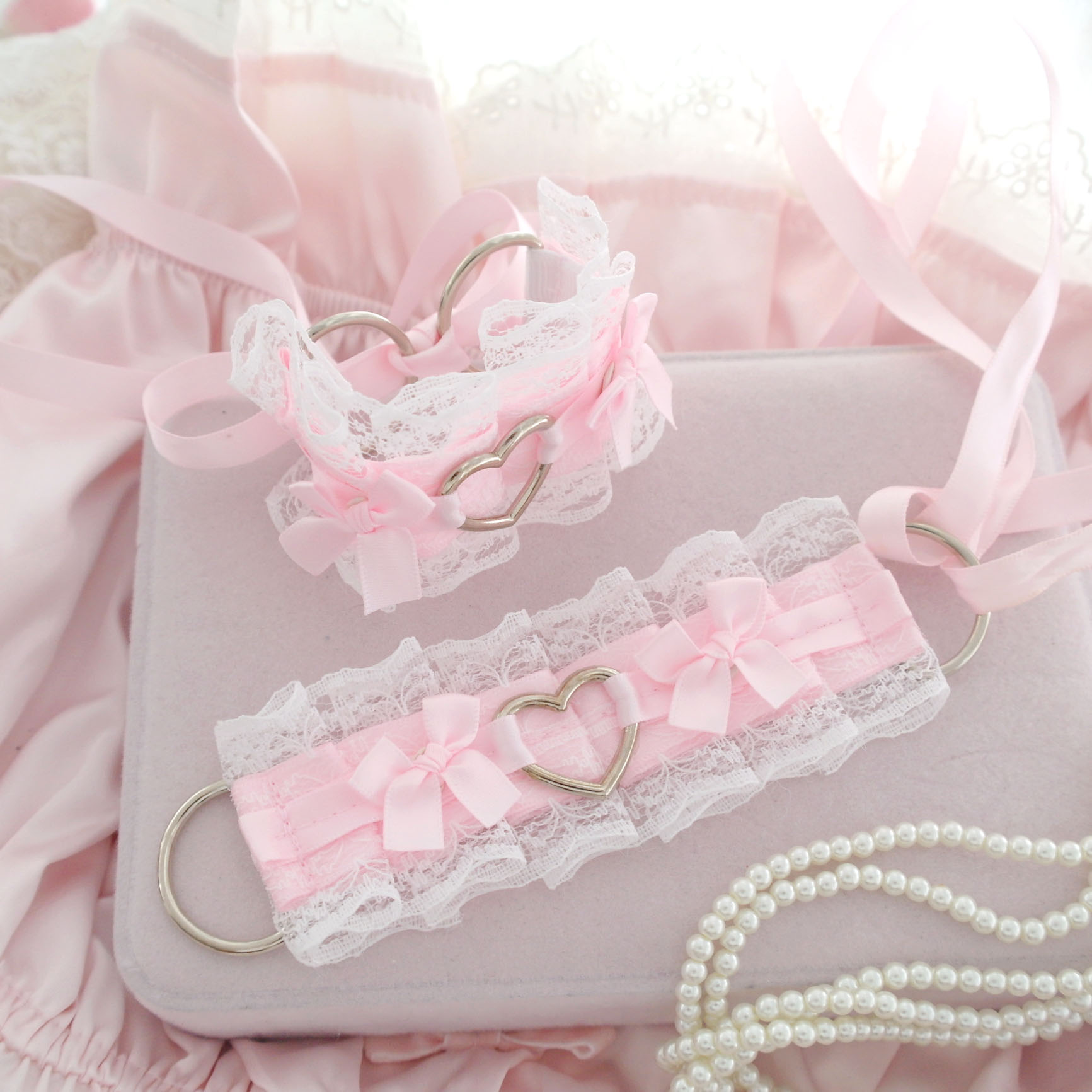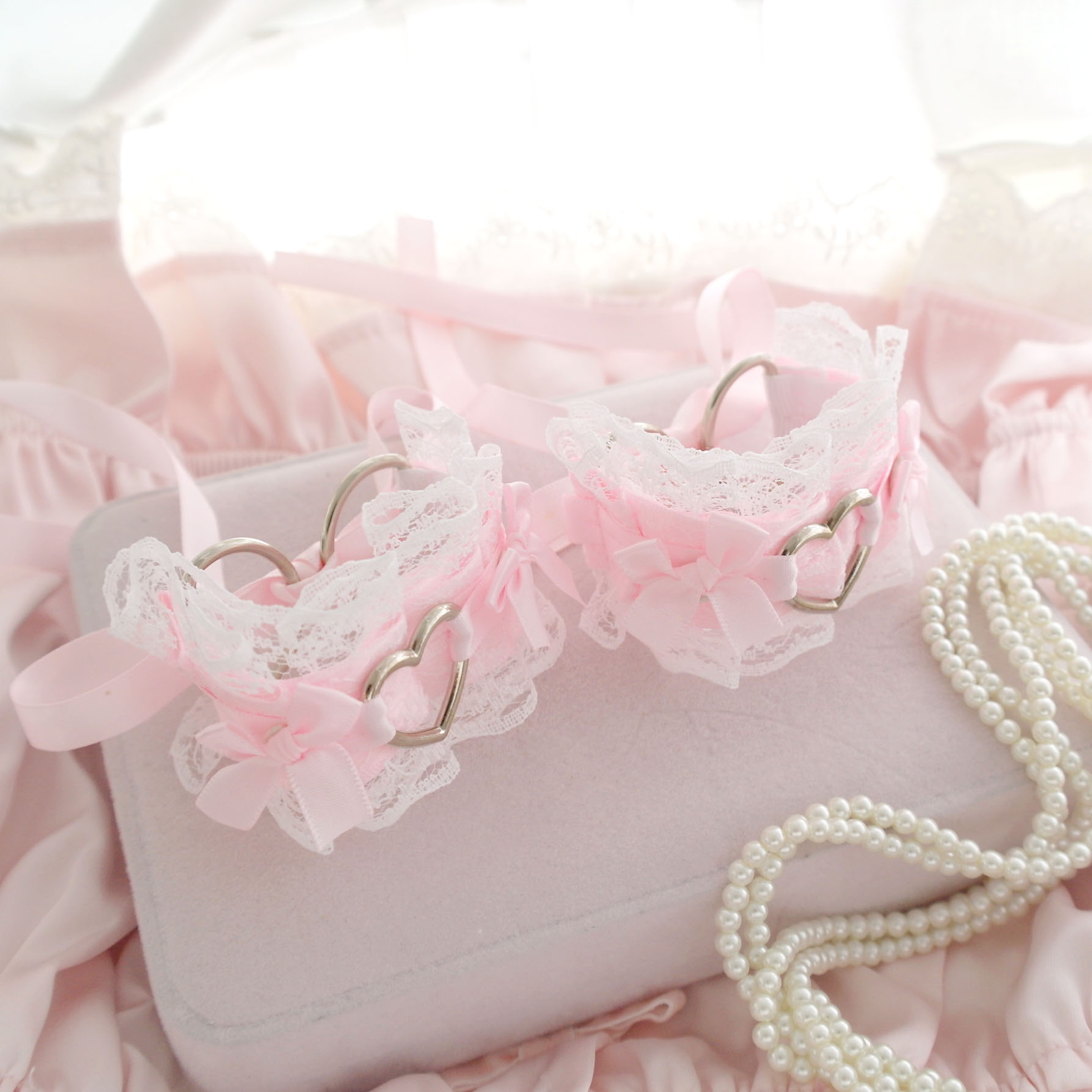 Heart Lace Cuffs Bracelet 2 pcs Set , Kitten Pet Play Gear Wrist Cuffs White Lace Baby Pink Bow , Kawaii Pastel DDLG Accessories