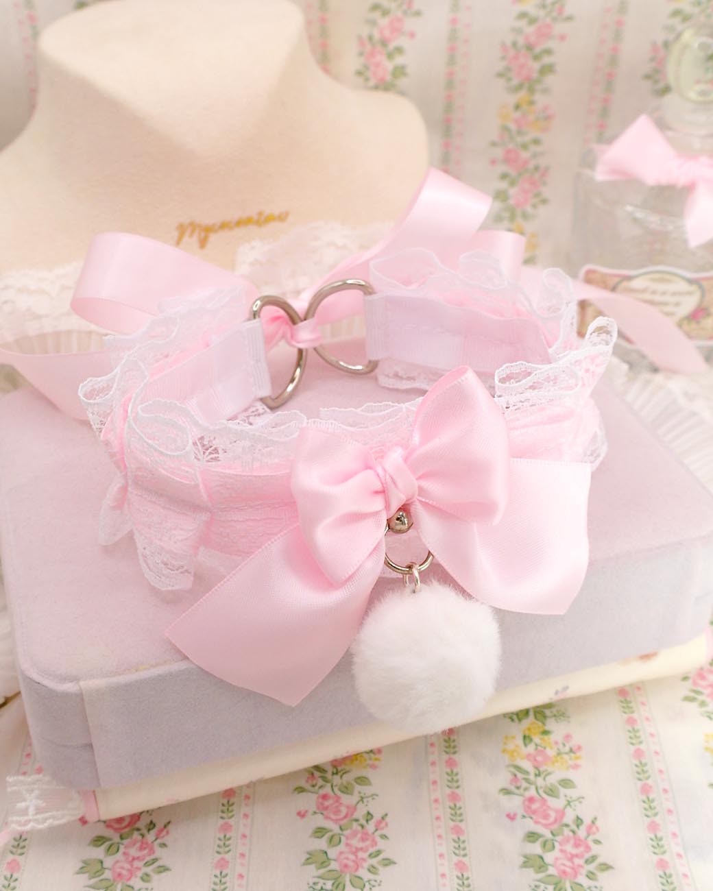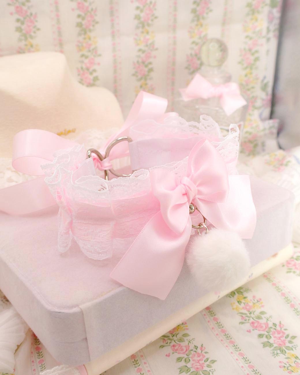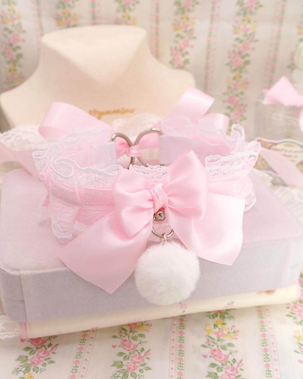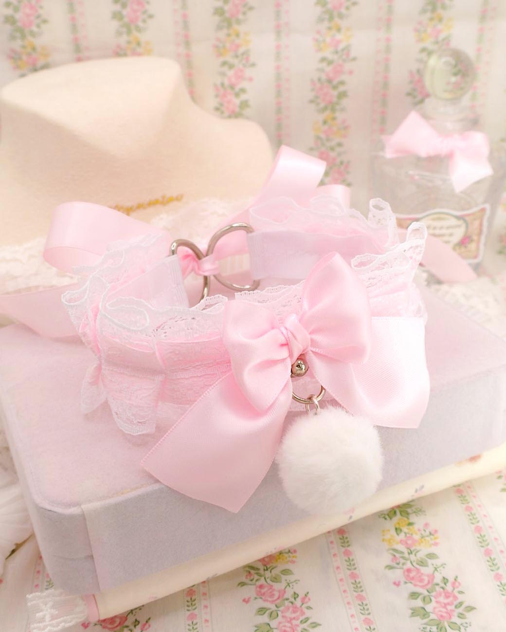 White Fur Ball Pom Pom Choker Necklace ,Kitten Play Collar, White Lace Baby Pink Bow O Ring , DDLG Cosplay Adult Play Gear Kawaii
