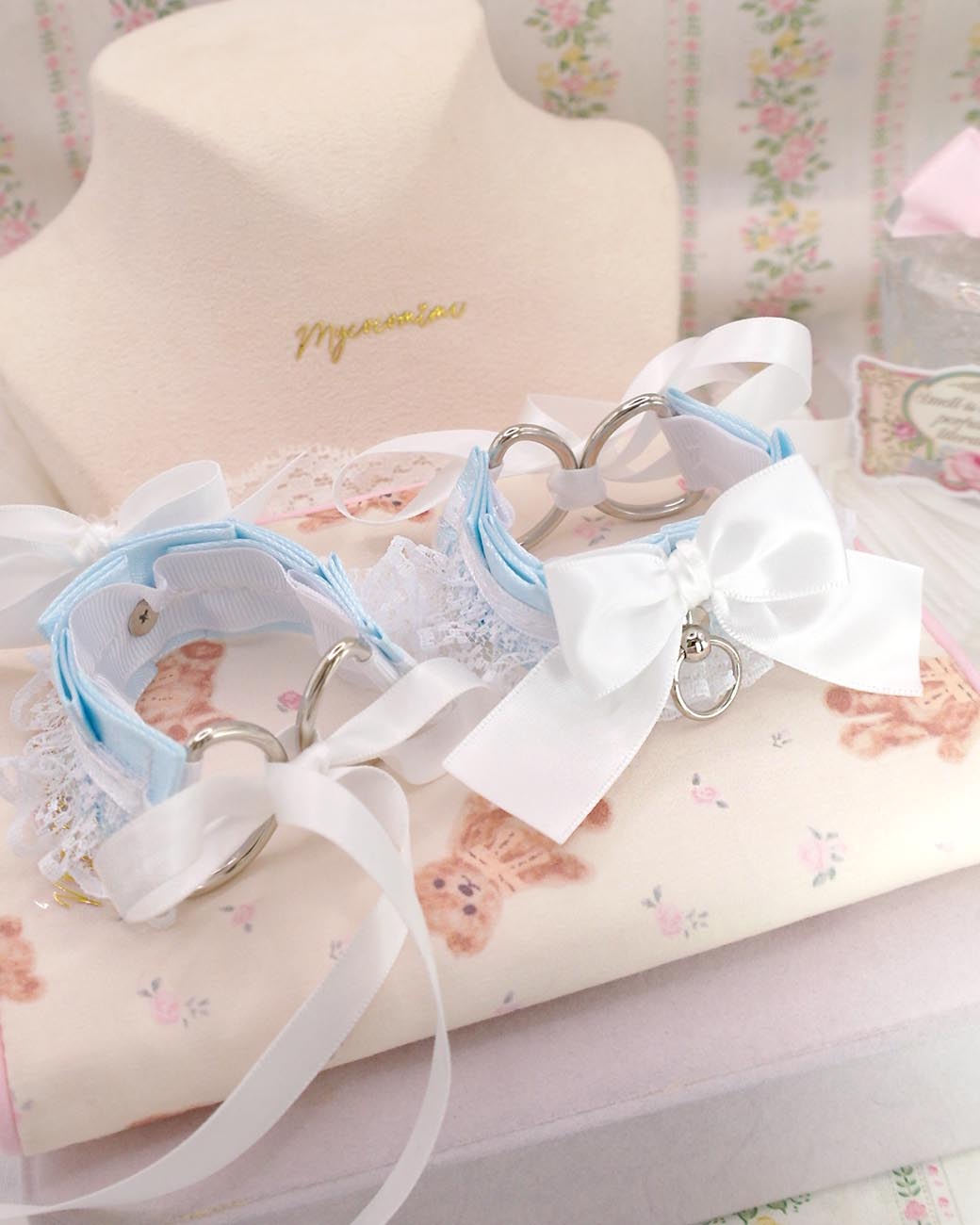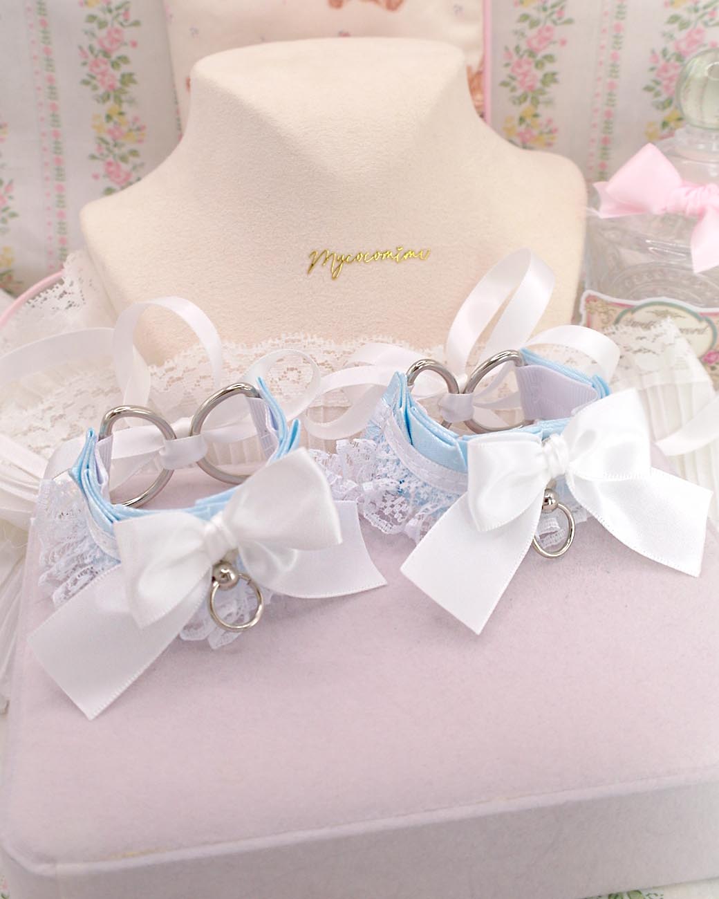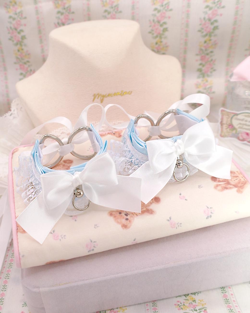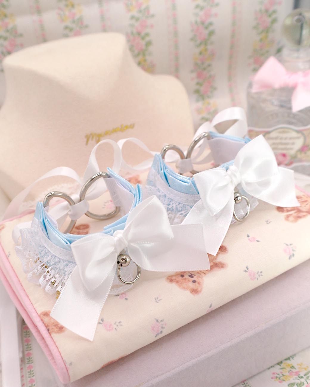 Wrist Cuffs 2 pcs Set, Baby Blue White Lace Bow Kitten Pet Play Gear Bracelet or ankle cuffs , Kawaii Pastel DDLG Alternative Accessories